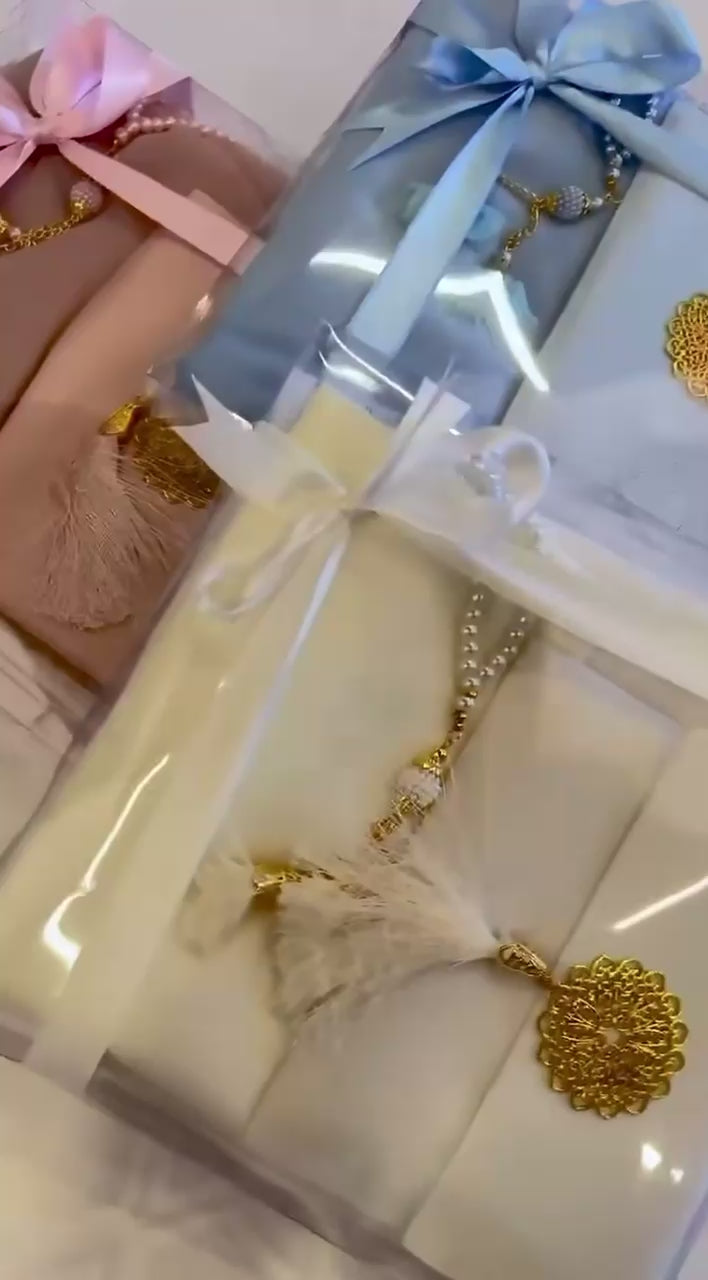 Le coffret comprend un tapis de prière, un Coran en arabe, un tasbih assorti, le tout présenté dans un coffret cadeau raffiné.